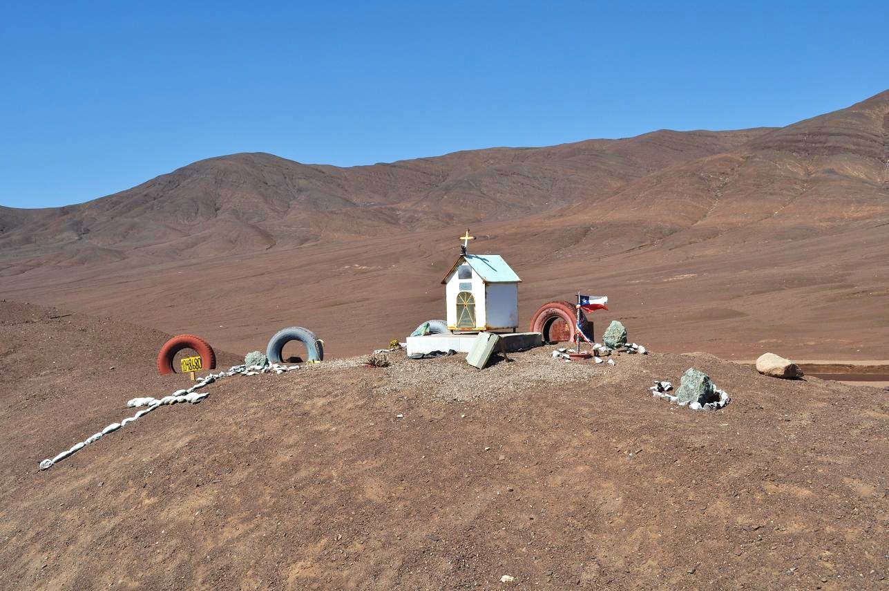The nil populated area between Calama Airport and San Pedro de Atacama must have had at least 30 shrines on a 60 mile stretch of relatively ordinary road. Most included a Chilean flag. Some had a kennel like structure protecting fresh flowers from the sun. A couple included mangled bikes, presumably the mode of transport of the victim. Another included a wrecked car behind the kennel.